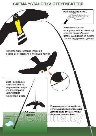 Монтаж воздушного змея не требует навыков - установленная соответствующим образом конструкция работает без Вашей помощи. При появлении ветра силой 3-4 м / с, змей самостоятельно взмывает в небо, успешно справляясь с задачей имитации полета хищной птицы. Также ведутся исследования по отпугиванию и прочих видов птиц-вредителей, если у вас проблемы с другими птицами -обращайтесь к Нашим специалистам за консультацией . Область применения: виноградники, сады, дачные участки, крыши зданий, причалы, пруды, ставки, свалки, промышленные территории и пр.