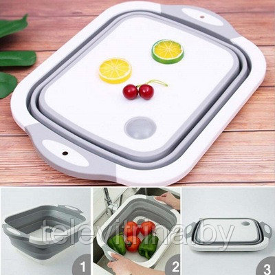 В сложенном состоянии разделочная доска, в разложенном состоянии превращается в удобную вместительную емкость для хранения и мытья овощей и фруктов, на дне есть клапан для слива воды.